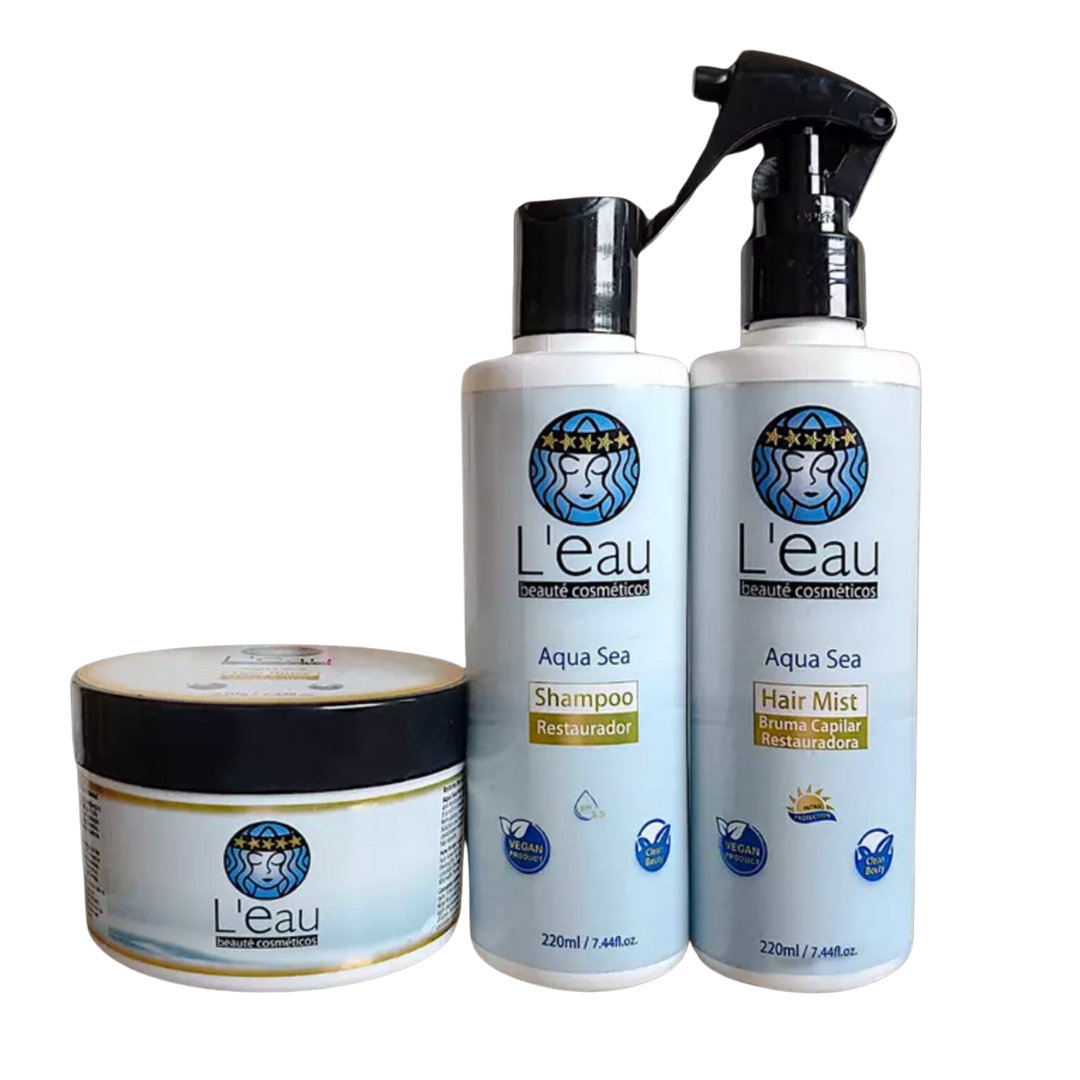 O Kit Aqua Sea é um tratamento completo que inclui Shampoo Restaurador, Máscara Capilar e Perfume Capilar. Ele limpa, hidrata e restaura profundamente os fios, além de perfumar com uma fragrância exclusiva, desenvolvida por um perfumista francês. Ideal para quem busca cabelos saudáveis, macios e com um brilho incrível.